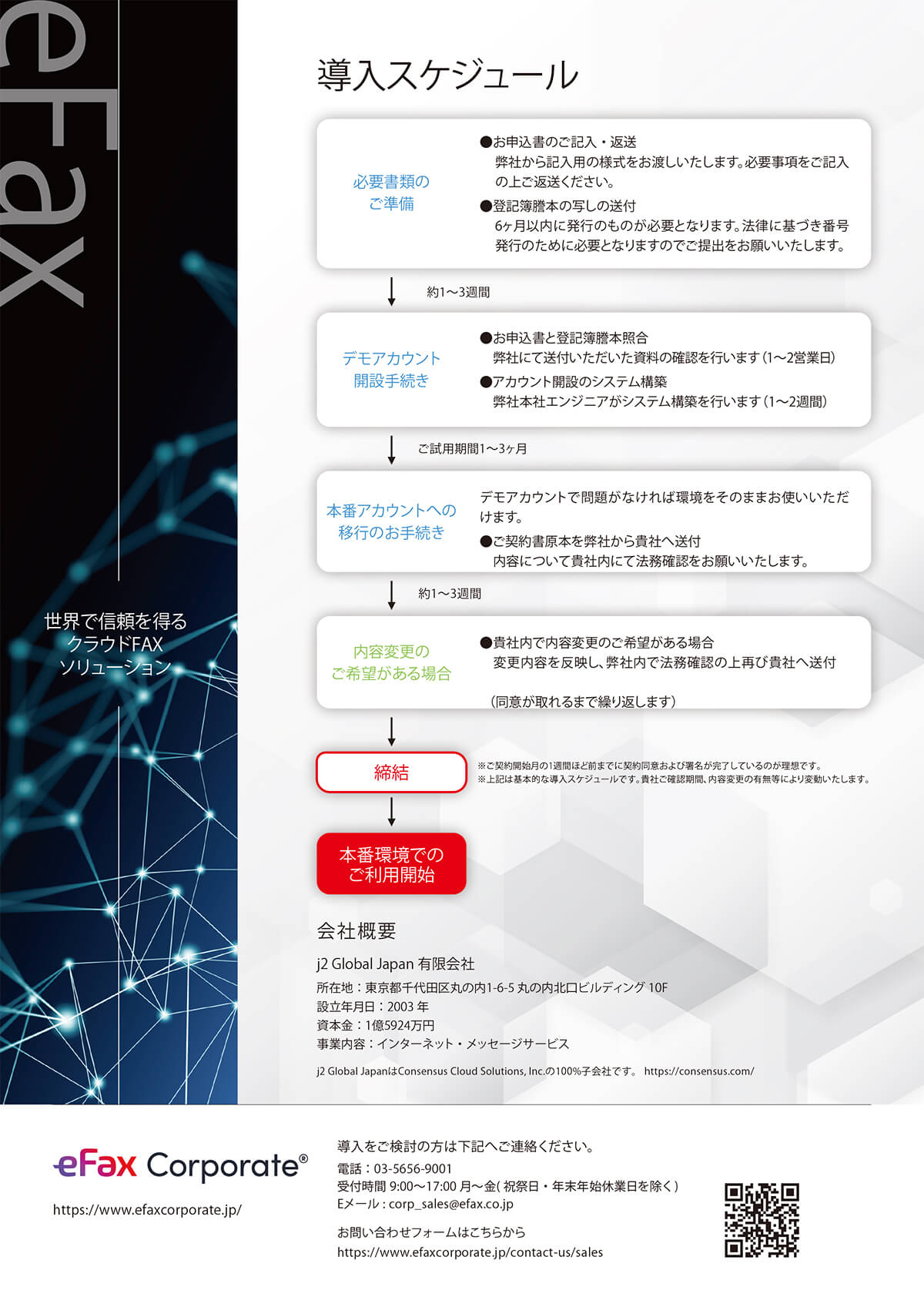 複数回線のお申し込みやご利用枚数が多いなど、法人向けインターネットFAXサービス『eFax Corporate®』のパンフレットです。